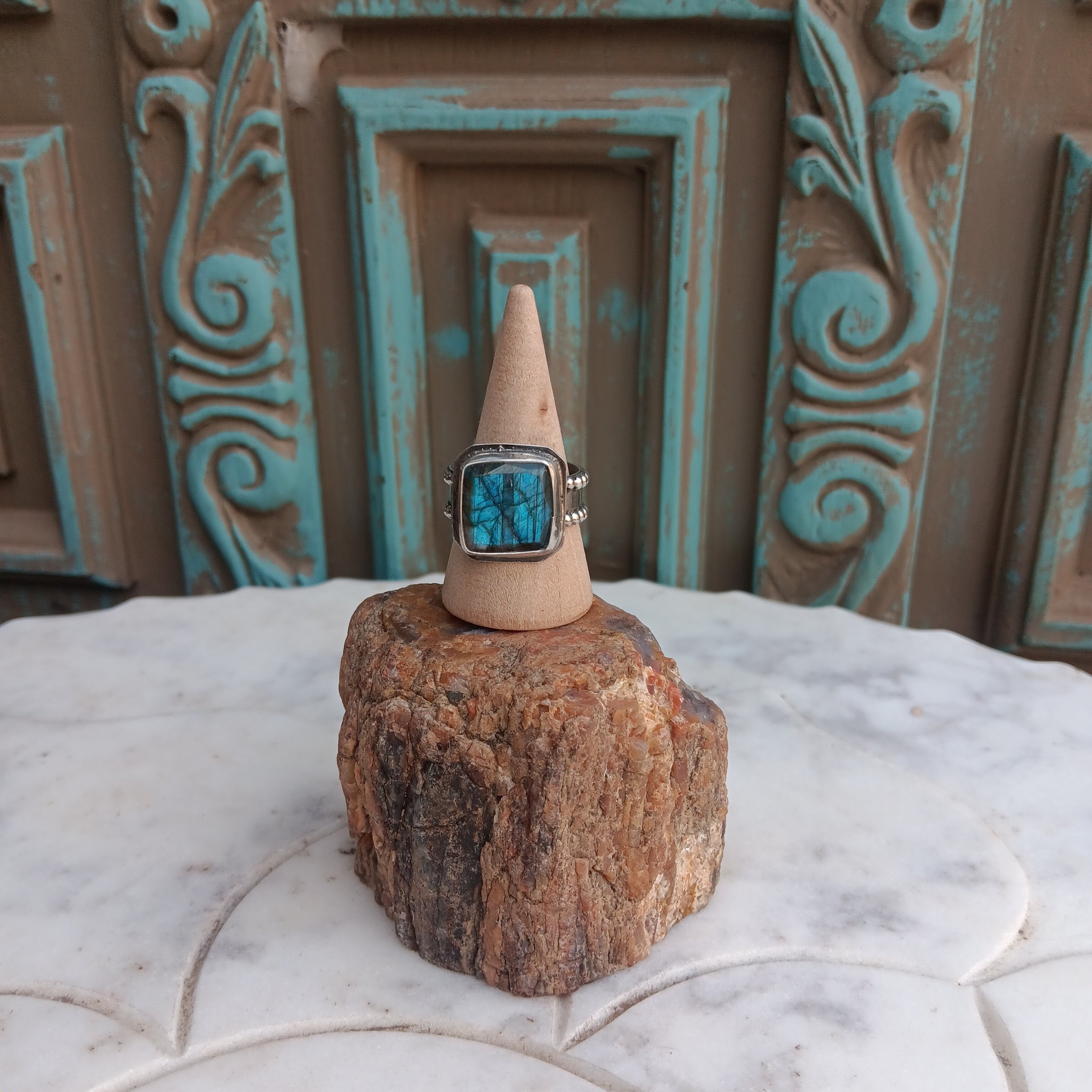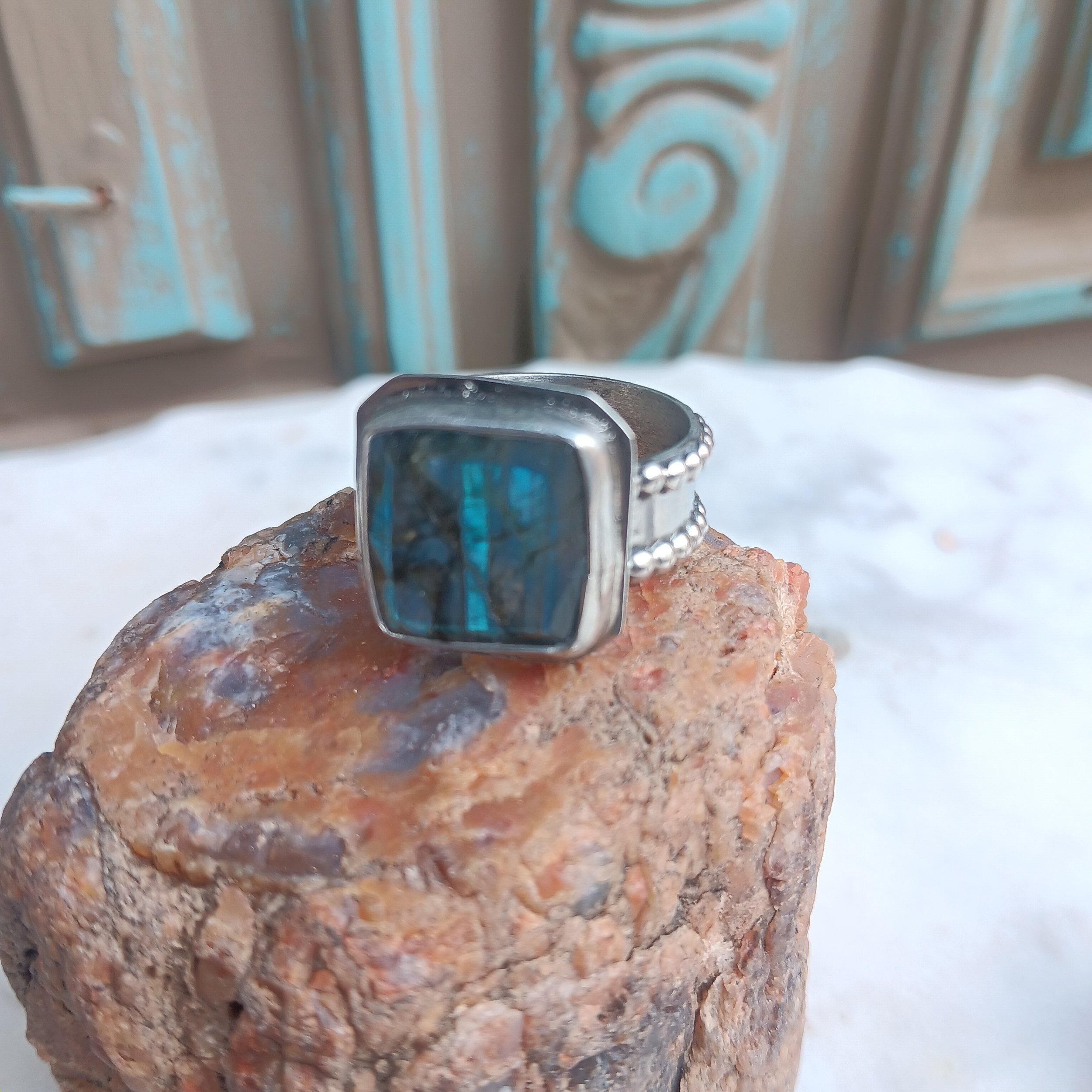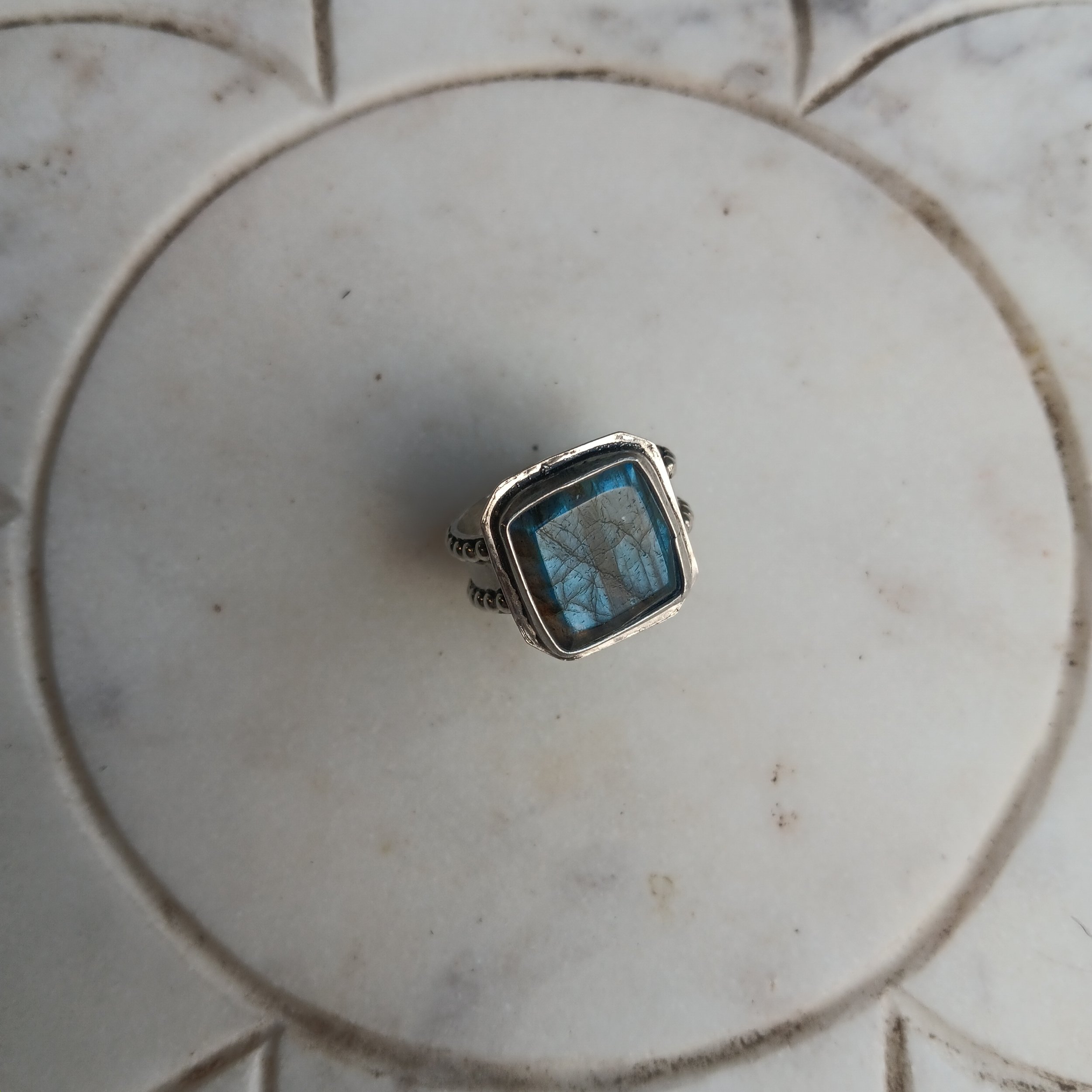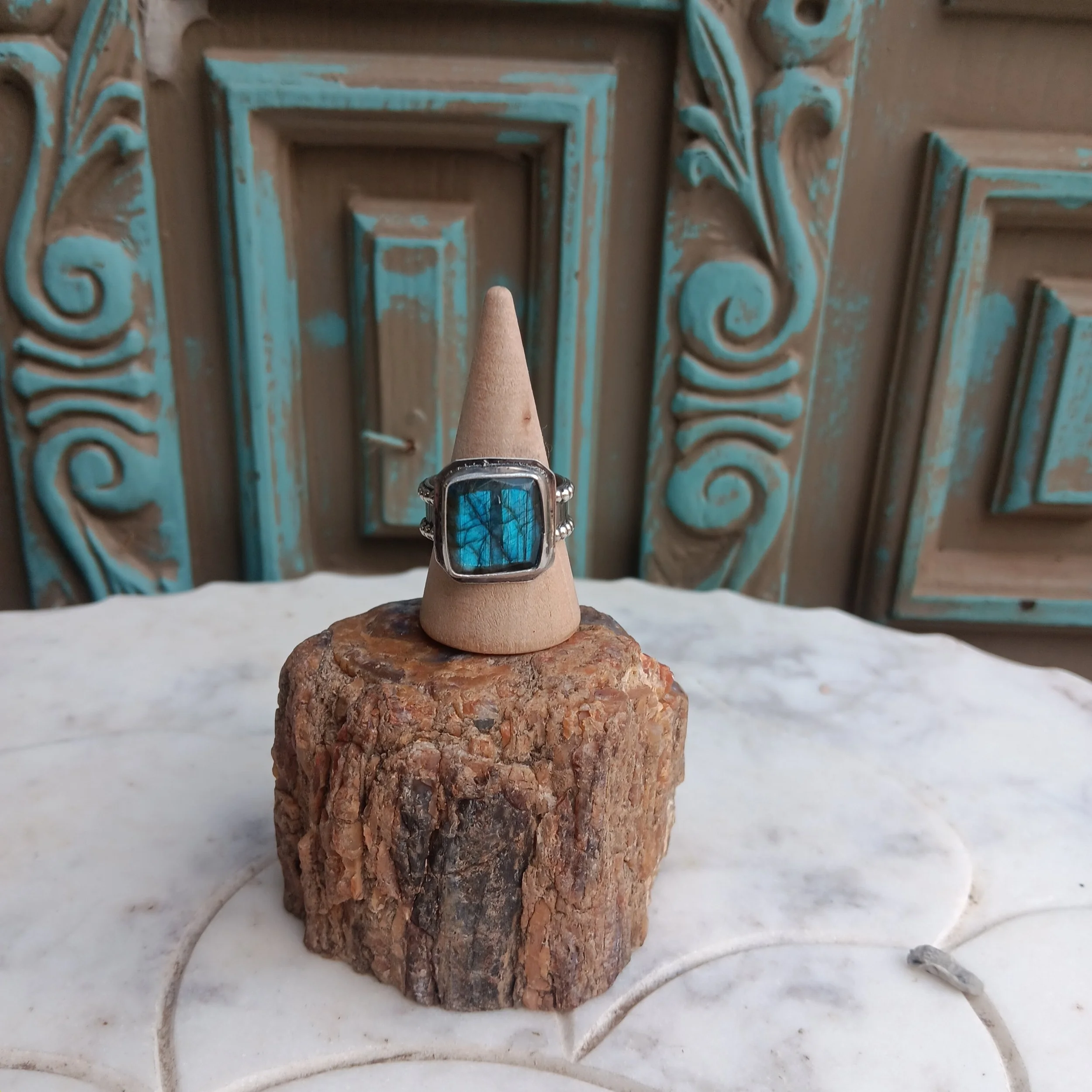 A statement of quiet confidence — this bespoke ring features a hand-selected blue flash Labradorite set in luminous sterling silver. Each stone is chosen for its electric play of color: flashes of cobalt and teal that catch light with every movement. The organic, slightly asymmetrical setting reflects the artisan's hand, creating a piece that feels both refined and uniquely alive.