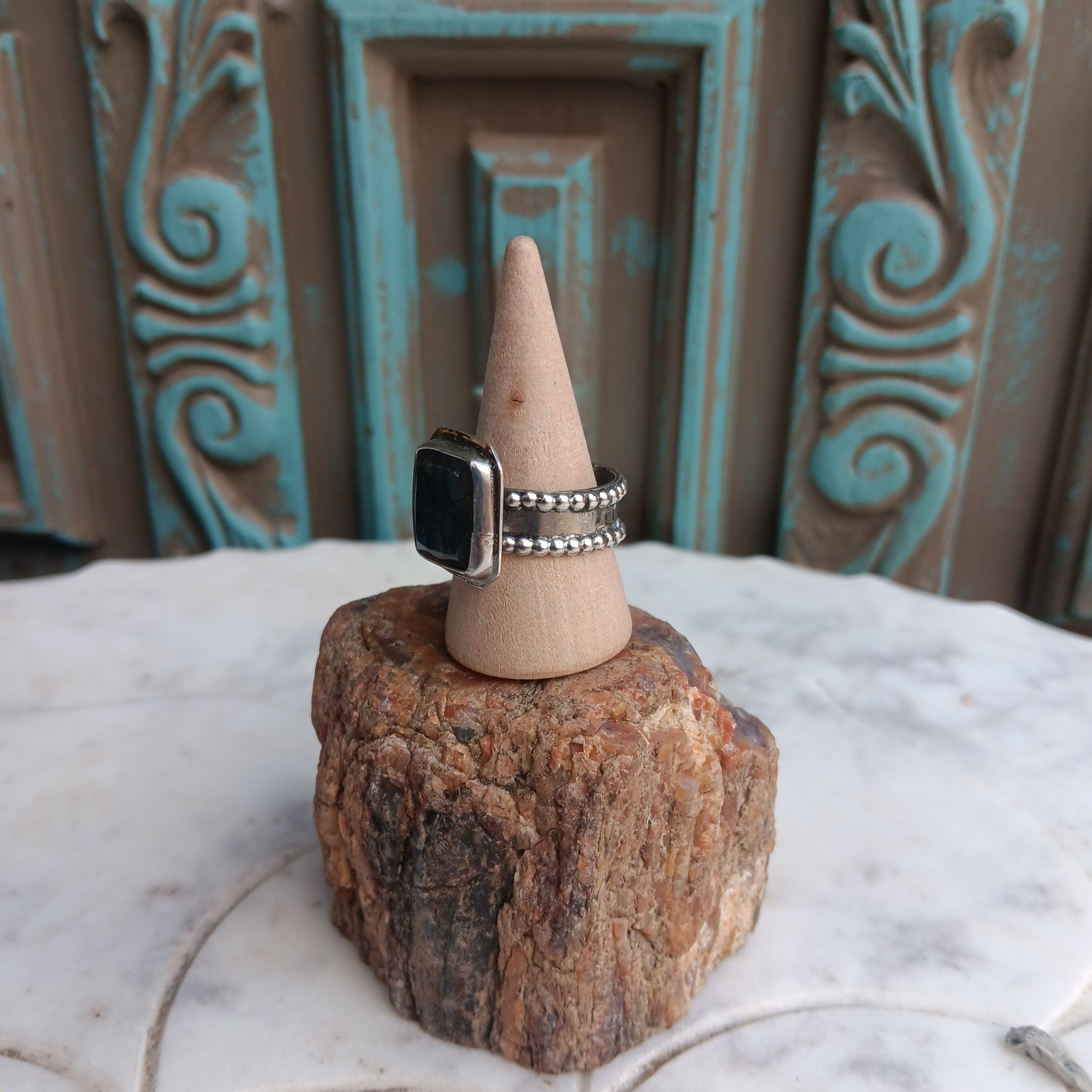Care Avoid harsh chemicals and prolonged water exposure. Clean with a soft cloth and gentle silver polish when needed. Store separately to protect the stone’s surface and the silver finish.